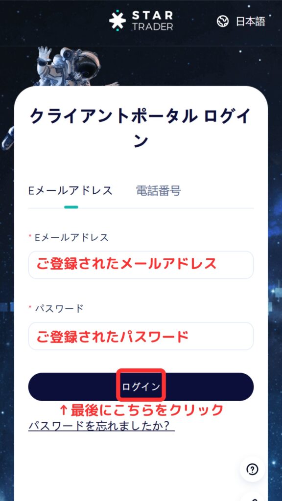 StarTrader(スタートレーダー)ログイン画面が表示されますので、登録情報を入力してログインします。