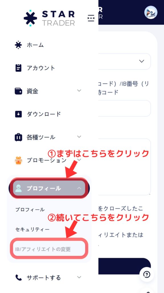 ③「プロフィール」→「IB/アフィリエイトの変更」の順でクリック
