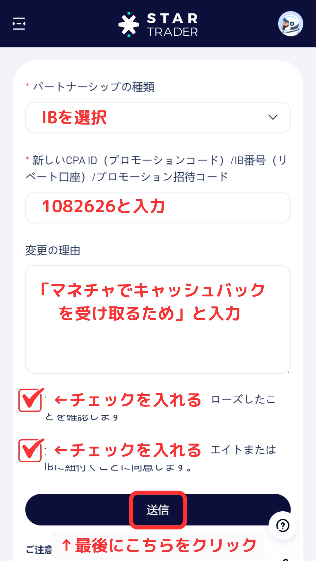 • Step1:StarTrader(スタートレーダー)のマイページからIB紐づけ変更依頼をする