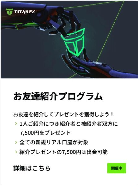 TitanFXでは、友達紹介キャンペーンなどを行っていますが、ボーナスキャンペーンよりも取引環境の強化に力を入れているので、ボーナスキャンペーンの開催自体は控えめです。