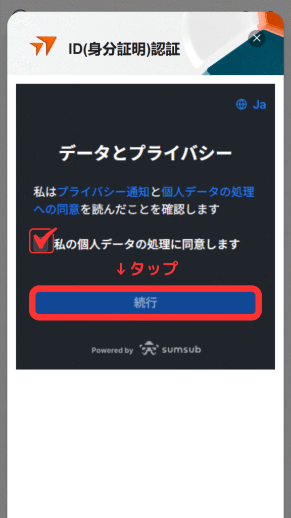 ⑤チェックを入れて「続行」をタップ