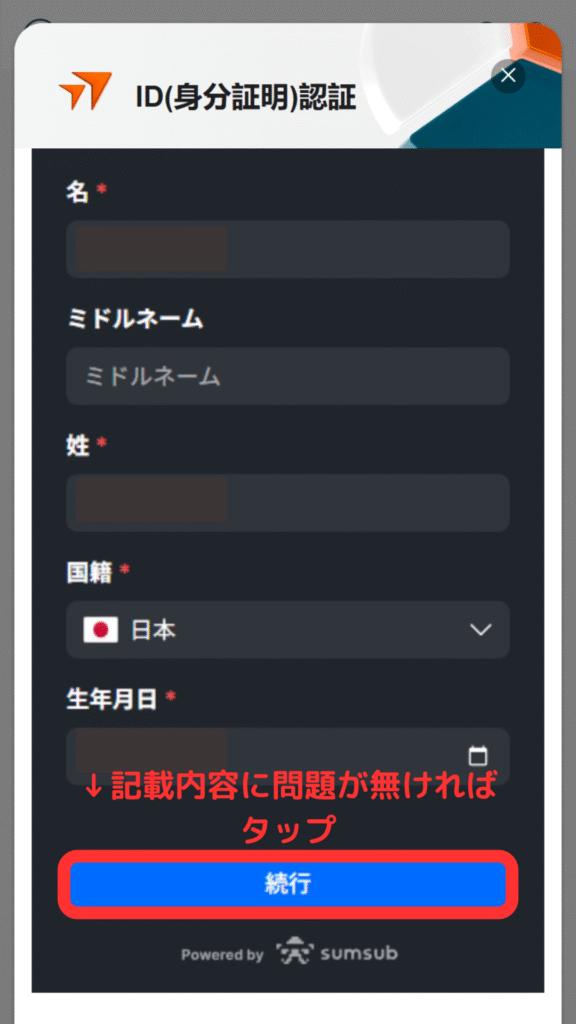名前があっているか確認し、「続行」をタップ