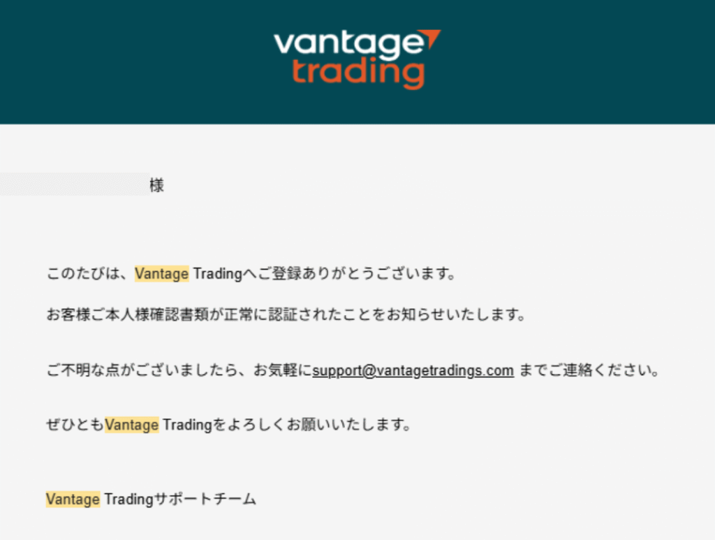 VantageTradingにて提出した書類の確認が完了しましたら、登録メールアドレス宛にVantageTradingからメールが2通届きます。