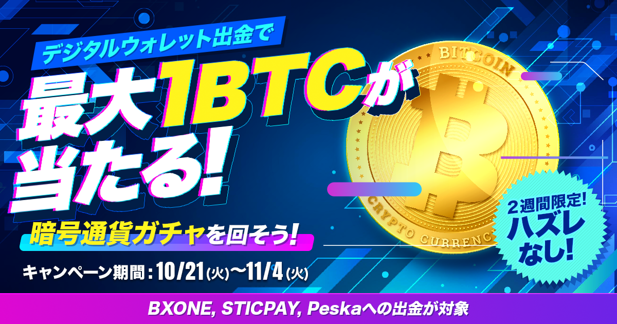 BXONE・STICPAY・Peskaへの出金で、もれなく“ハズレなし”暗号通貨ガチャチケットをプレゼント🎁