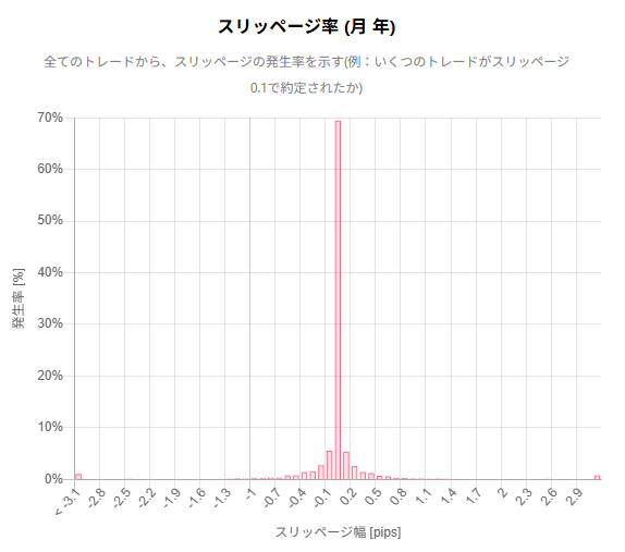 全注文のうち約60%がスリッページ幅0.1pips以内で、ほとんどの注文が±0.3pips以内に収まっています。