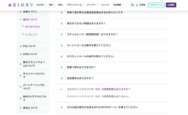 AXIORYは特段取引制限がなく、EAの使用やスキャルピングに対して寛容な姿勢を示しています。