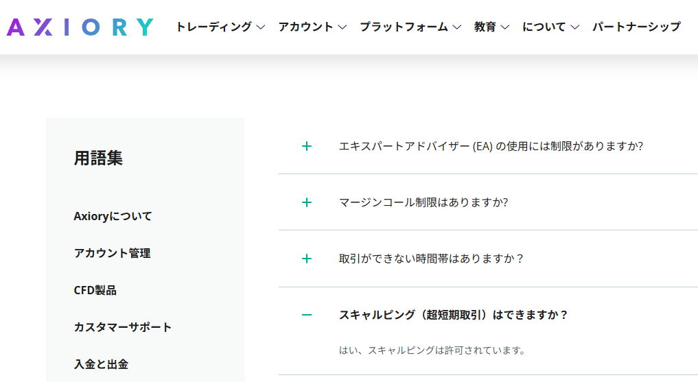 AXIORYは公式サイトのF&Qでも堂々とスキャルピングができることを記載しています。