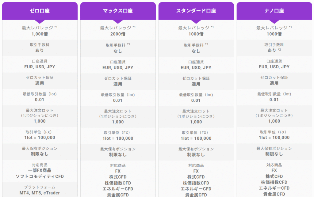 | 口座タイプ | テラ口座 | ナノスプレッド口座 | マックス口座 |