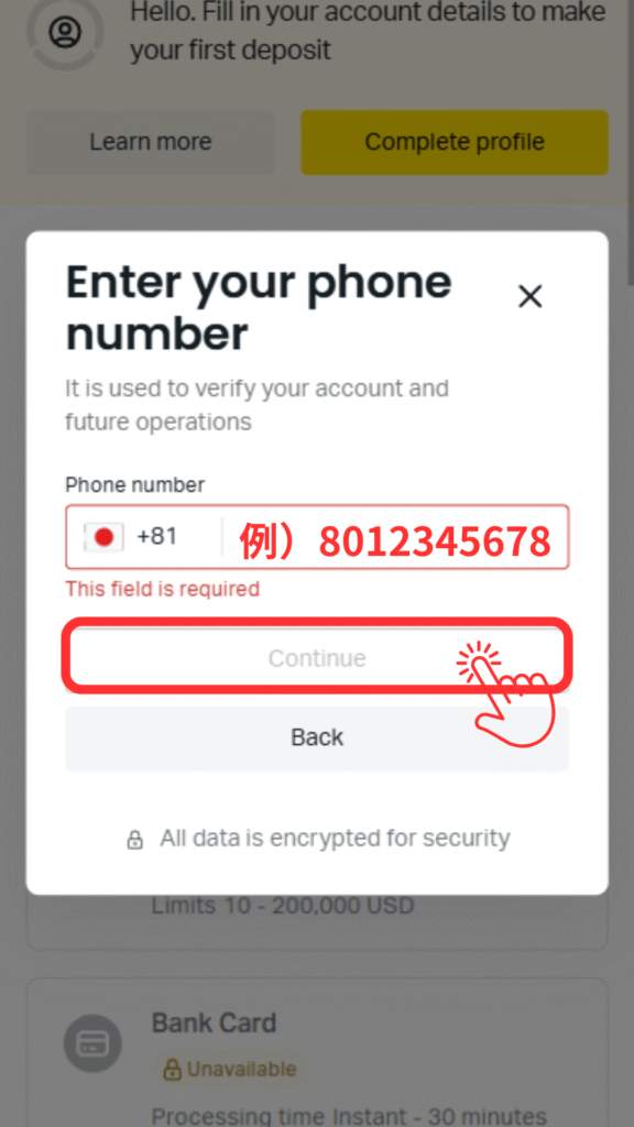 ※頭の0を除いて入力してください(例:080-1234-5678の場合、8012345678)