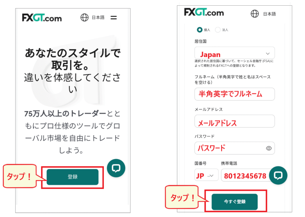 まず、FXGT公式サイトから「登録」ボタンをタップして、新規登録を行います。
