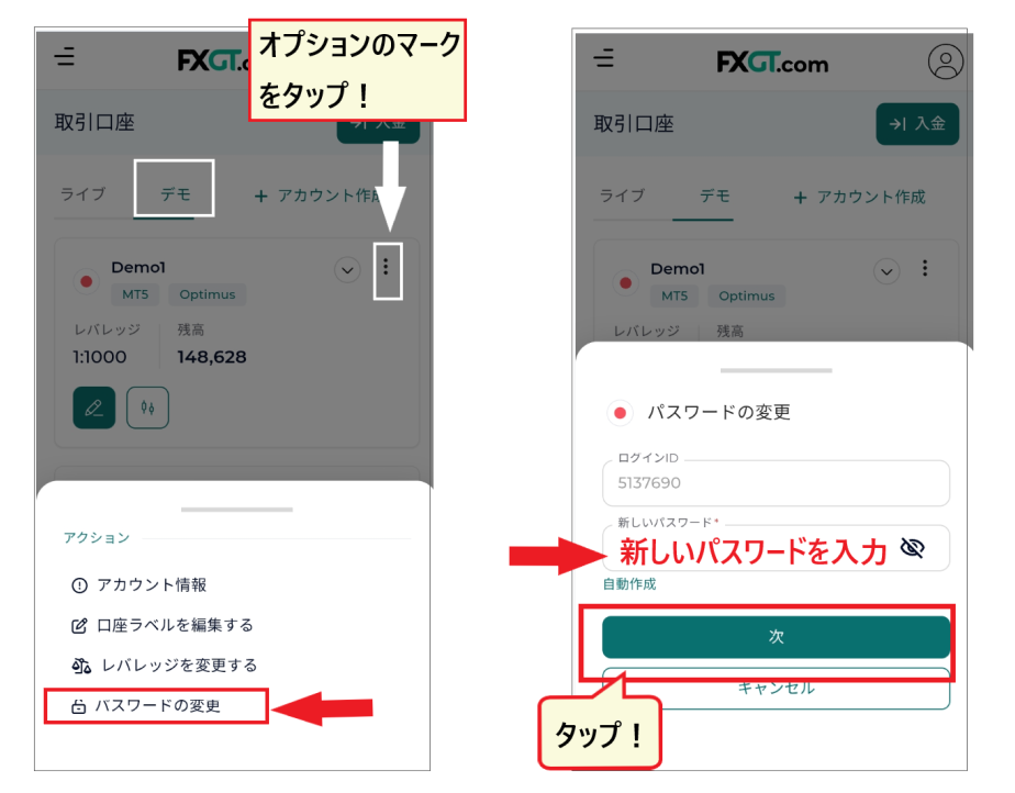 パスワードの変更は、会員ページのメニュー「取引口座」→「口座情報の右上にあるオプションマーク」→「パスワードの変更」にて行えます。