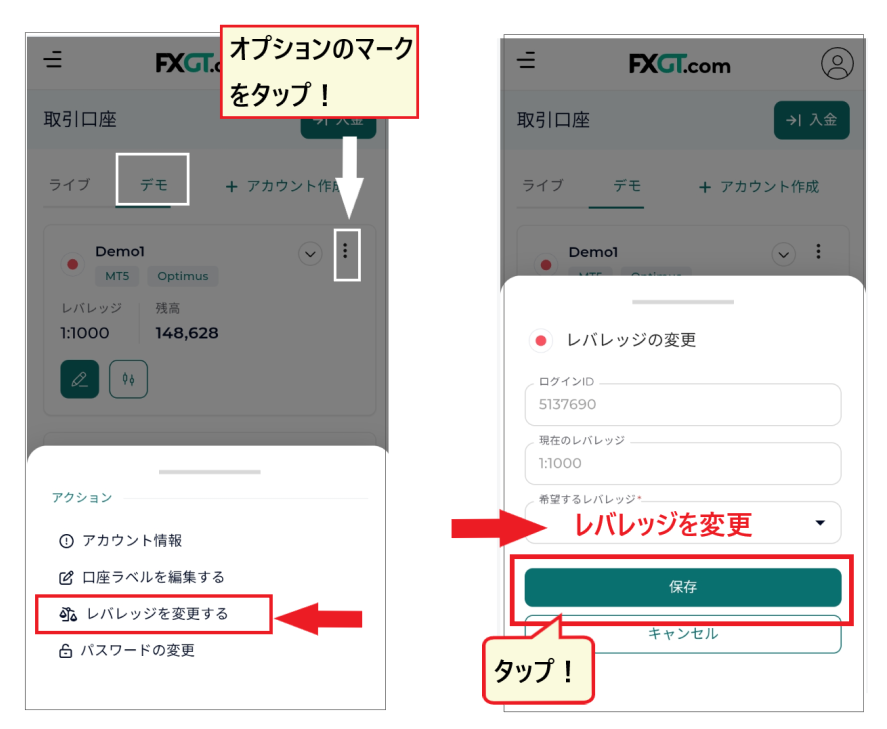 レバレッジの変更は、会員ページのメニュー「取引口座」→「口座情報の右上にあるオプションマーク」→「レバレッジを変更」にて行えます。
