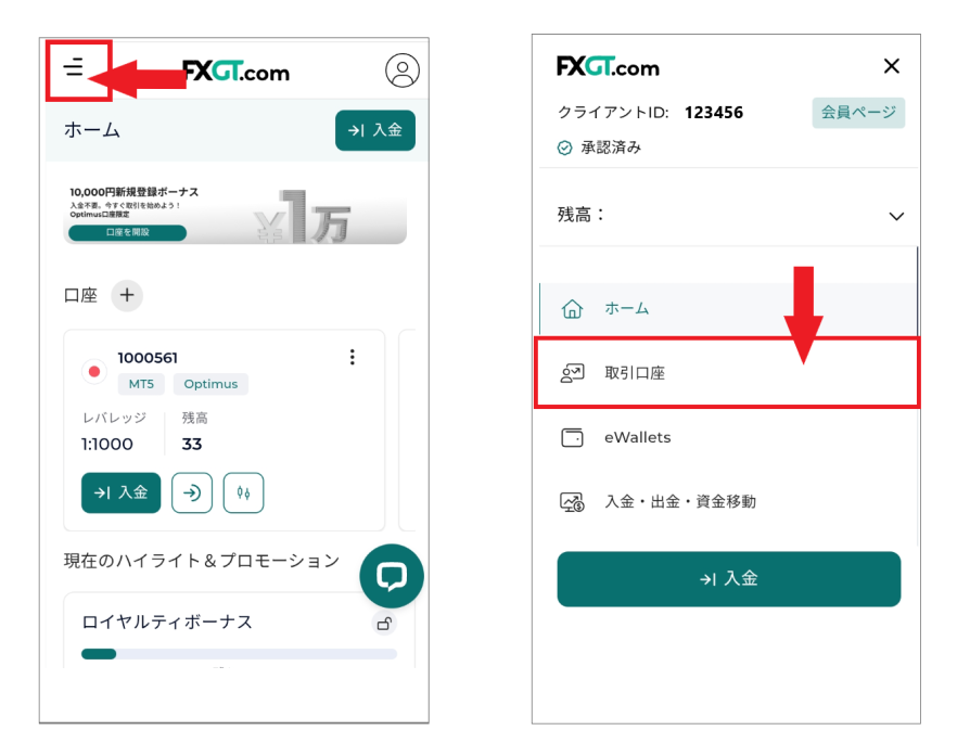 左上にあるメニューを開いて、「取引口座」→「アカウント作成」へと進みます。