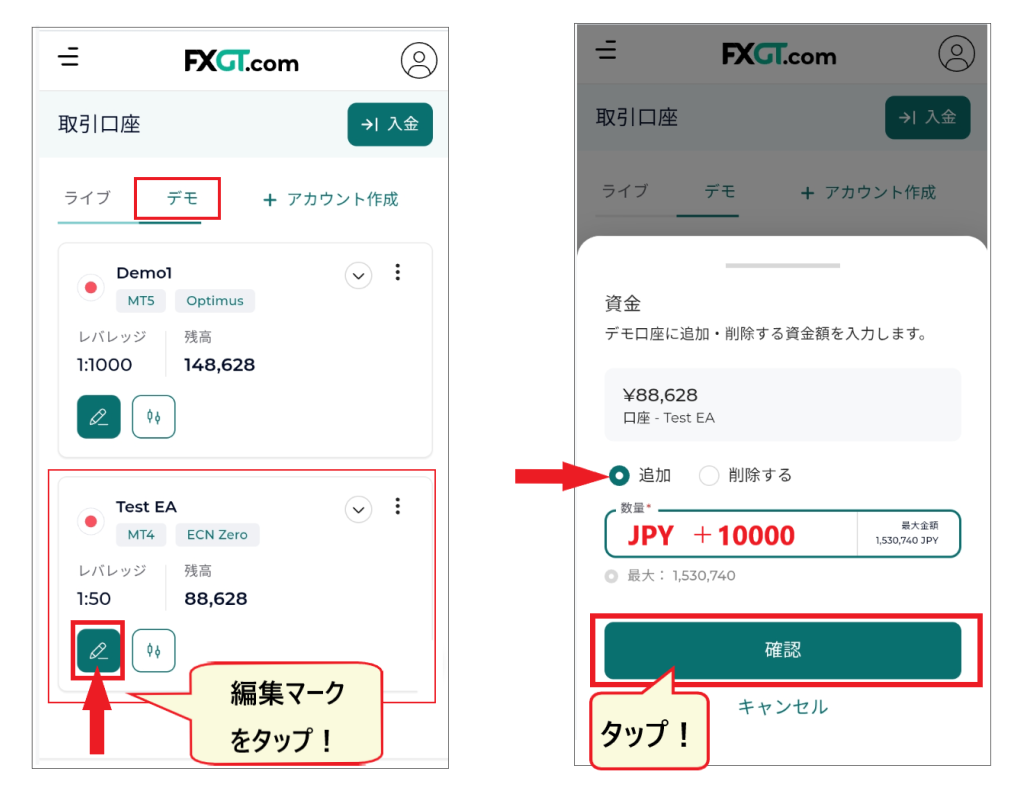 デモ口座の残高を増やしたい時は、会員ページのメニュー「取引口座」→「デモ」→「編集マーク」→「追加」で設定できます。