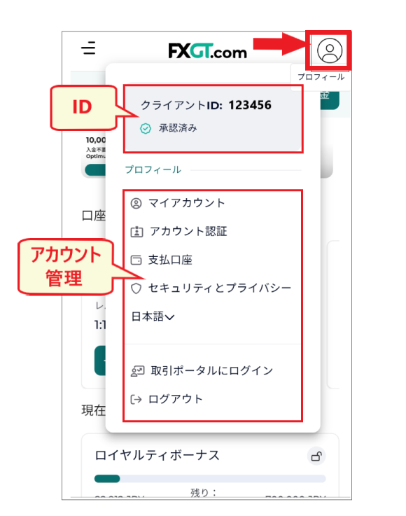 デモ口座のログインIDやサーバー名はは変更できませんが、情報を確認したい時は「プロフィールのアイコン」から確認できます。このアイコンメニューを開くと、各種アカウント情報が表示されますので、覚えておきましょう。