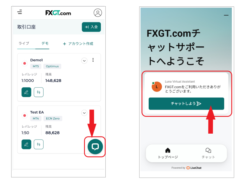 FXGTのカスタマサポートへの問い合わせは、会員ページ右下にあるライブチャットのマークから簡単にアクセスできます。日本時間の営業時間内であれば、すぐにライブチャットで担当と話しができます。