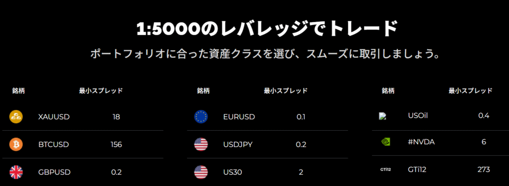 | 最大 レバレッジ | 5000倍 | 1000倍 | 1000倍 | 200倍 | 500倍 | 1000倍 |
