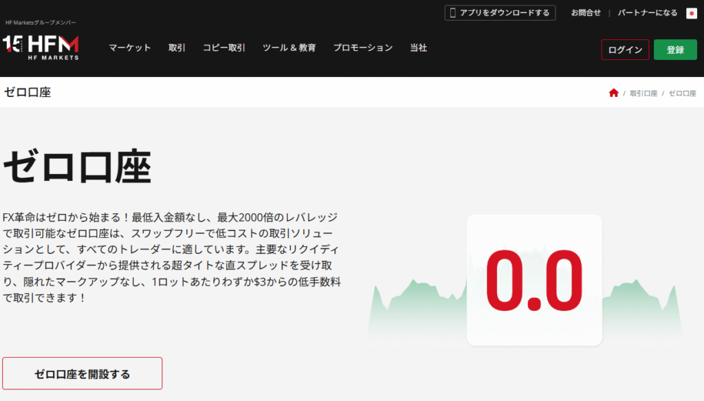 セント口座(超少額取引用)、プロ口座(低スプレッド特化)、ゼロスプレッド口座(ECN型)、トップアップボーナス口座(ボーナス特化)、HFコピー口座(コピートレード専用)という特徴的な名前で差別化を図っています。