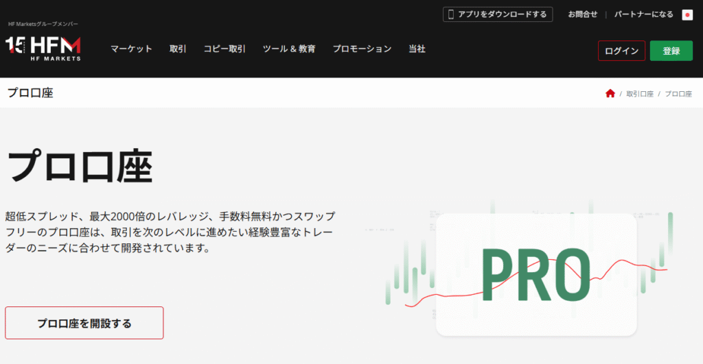 HFMのプロ口座は、業界最狭水準のスプレッドと手数料無料を両立した口座タイプです。