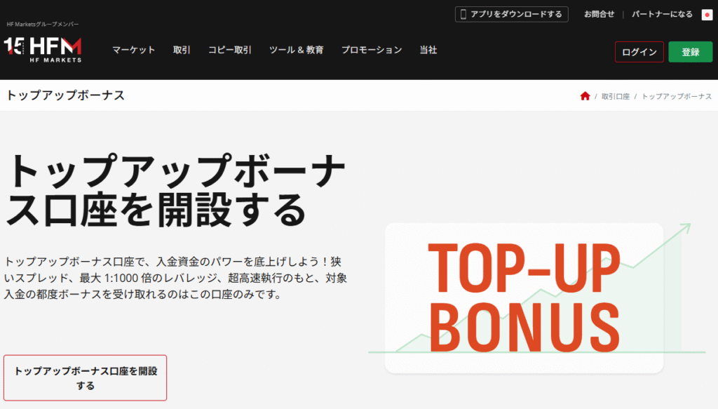 プロ口座は100ドル、HFコピー口座のフォロワーは25ドル、トップアップボーナス口座は決済方法により約200ドルが必要となります。