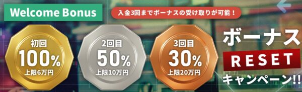 その中には100%入金ボーナスもあり、初回入金時に入金額と同等のボーナスを受け取ることができるため、証拠金が2倍の状態で取引を行うことができる人気のボーナスキャンペーンです。