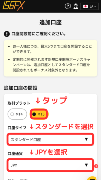 - 特にこだわりがなければ「MT5」、「スタンダード」口座、「JPY」を選択しましょう。
