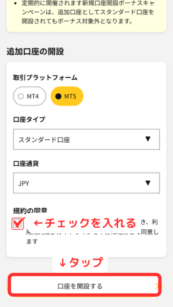 ④「規約の同意」にチェックをし、「口座を開設する」をタップします。