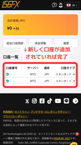新しく「口座情報」が表示されたらIS6FXの追加口座開設は完了です。