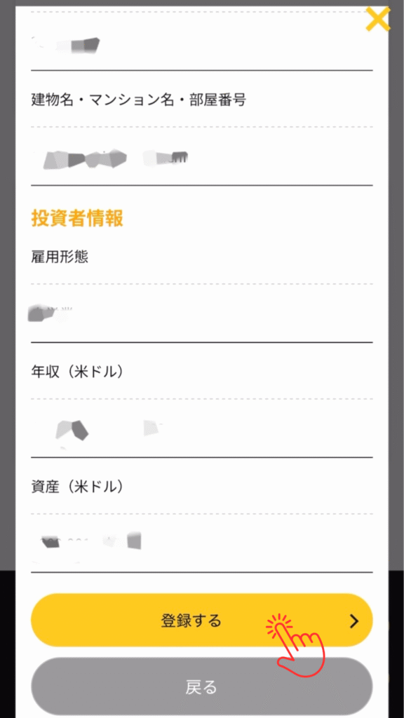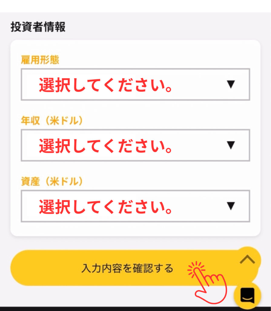 投資家情報を入力し、「入力内容を確認する」をタップしてください。