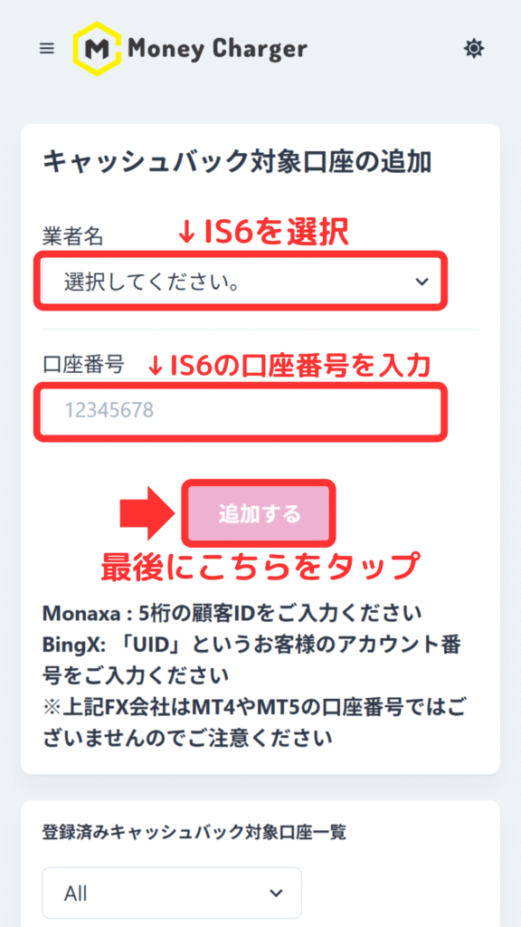 Step4:MoneyChargerのマイページより、FX口座登録申請をおこなう