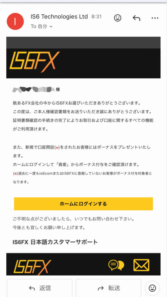 最後にメールを開くと、開設したIS6FX(アイエスシックスエフエックス)の、