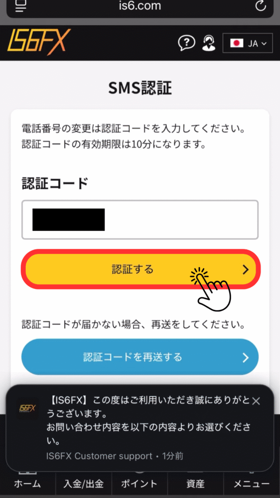 入力した電話番号宛てにSMSで認証コードが届きますので、入力して「認証する」をタップします。