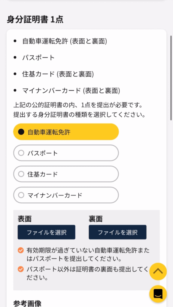 提出する身分証明書を選択し、「ファイルを選択」をタップして身分証をアップロードしてください。