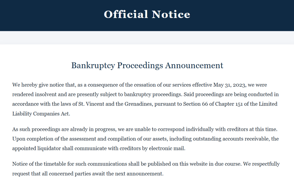 GalaxyDAOは、経営破綻となったGemforexを買収した仮想通貨トークン系業者です。2024年2月9日の運営停止発表後、Galaxy DAO公式サイトは破産手続き中の「Gemtrade LLC」に関するページ(https://gemforex.io)にリダイレクトされる状態となっています。