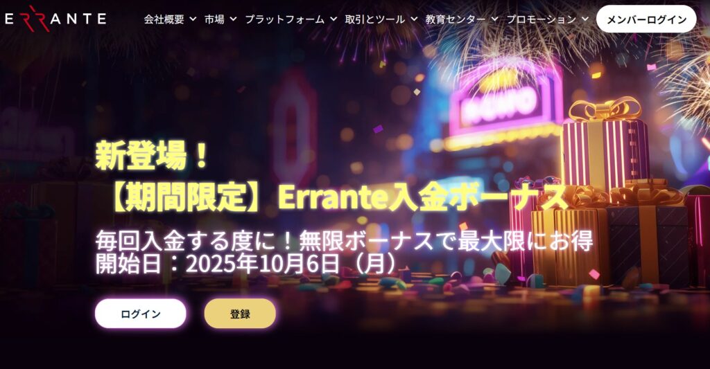 - 入金ボーナス2位:【Errante】100%で最大100,000円!