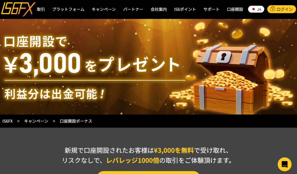 ![]() IS6FX | 3,000円 | 【初回】100%(上限6万円) 【2回目】50%(上限10万円) 【3回目】20%(上限10万円) | 〇 | 詳細 | 口座開設ボーナス大幅アップ |