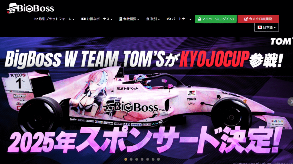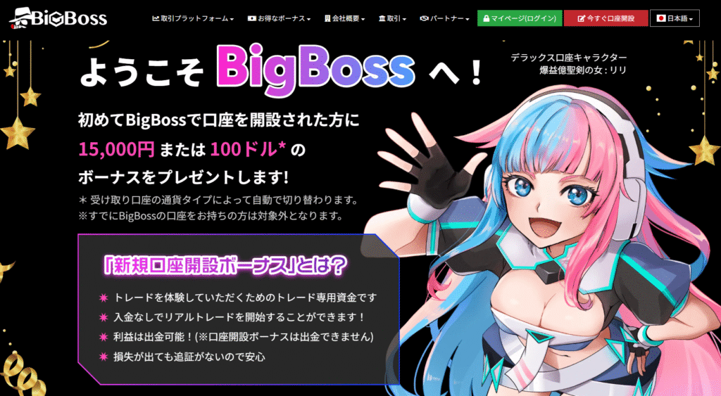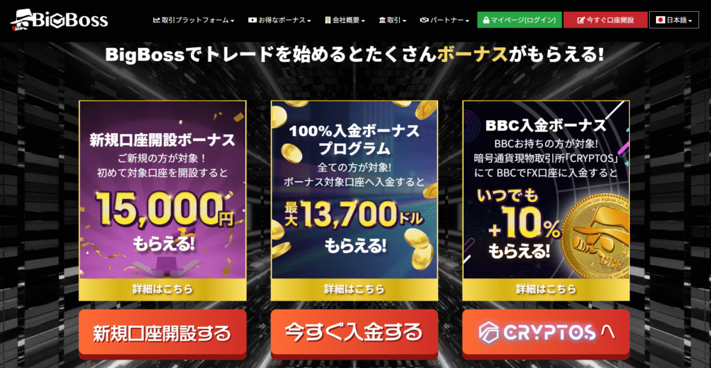 ![]() Bigboss | 15,000円 | 【初回】100%(上限700ドル相当) 【2回目】30%(上限5,700ドル相当) 【3回目】20%(上限6.32万ドル相当) | 〇 | 詳細 | 口座開設ボーナス金額アップ ~10月31日まで |