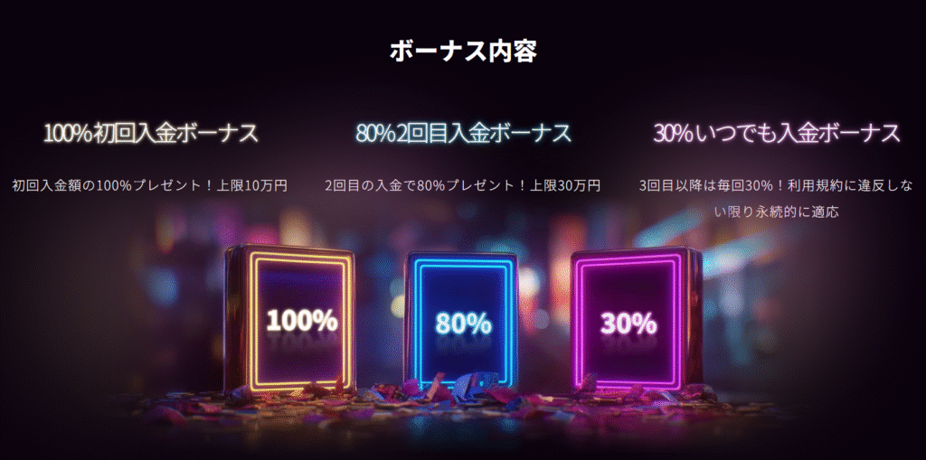 - 100%~120%Welcomeボーナス(上限80,000円)