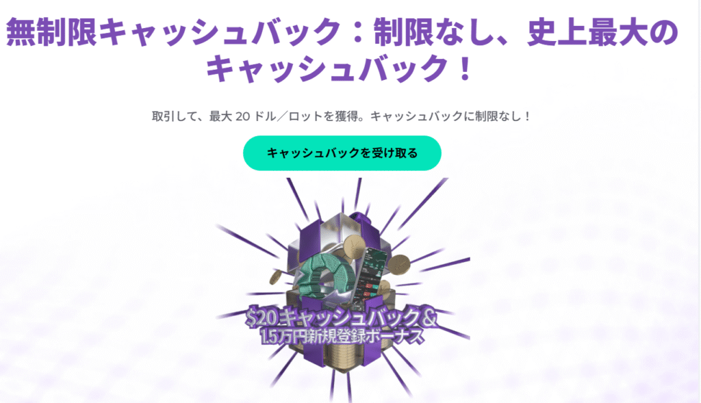 新規の口座開設では「15,000円の口座開設ボーナス」と「100%~120%初回入金ボーナス」で自己資金の倍以上の証拠金が得られます。2回目以降の入金では「50%入金ボーナス」「20%入金ボーナス」と続き、さらに規定の通貨ペアの取引で「最大2,000ドル」のキャッシュバックも。